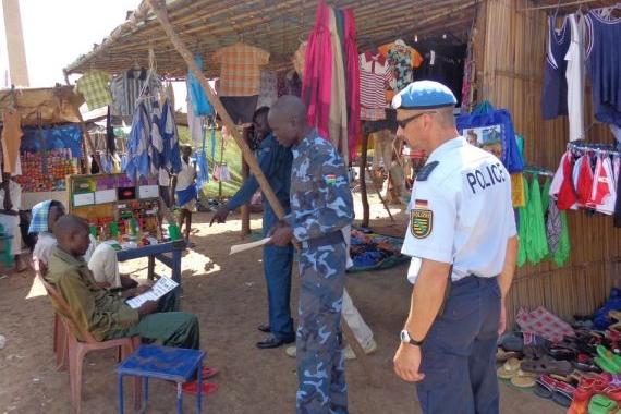 UN Police assisting South Sudan National Police Service distribute emergency phone number in Bentiu, Unity. Photo: UNMISS/Sarkar Talpola. Click for larger photo.