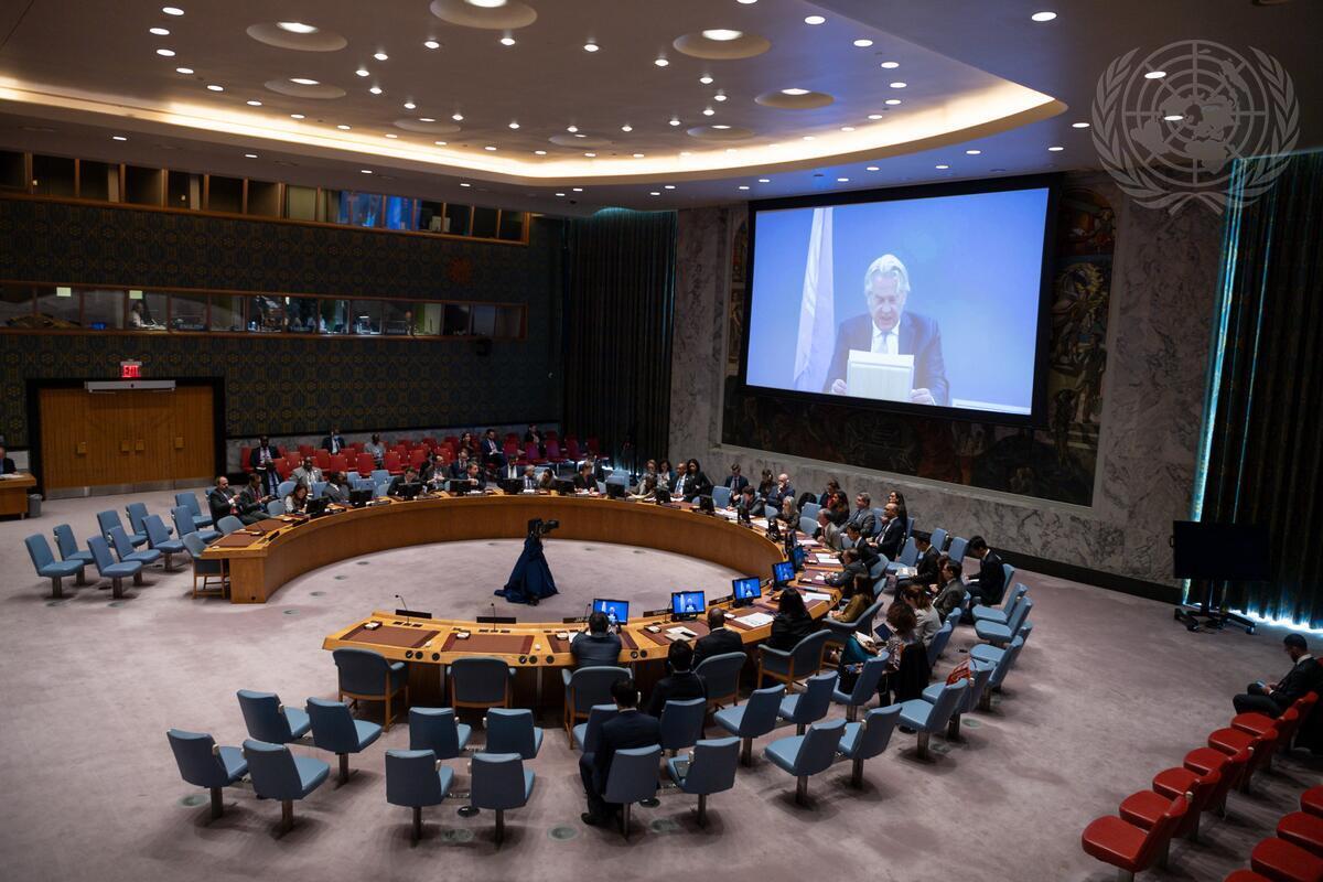 A wide view of the Security Council meeting on the situation in the Middle East, including the Palestinian question. On the screen is Tor Wennesland, Special Coordinator for the Middle East Peace Process. (27 September 2023 - UN Photo/Rick Bajornas)