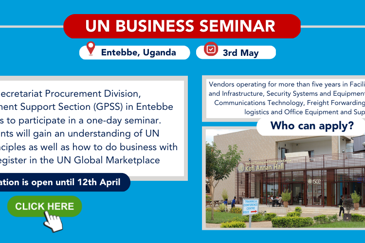 The UN Secretariat Procurement Division, Global Procurement Support Section (GPSS) in Entebbe is planning to conduct a one-half-day UN Business Seminar in RSCE/RTCC Conference Room, Entebbe Support Base on 3 May 2023. The…