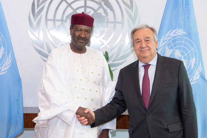 Abdou Abarry (left), here on 4 June 2019 after the presentation of his credentials to Secretary-General António Guterres as Permanent Representative of the Republic of Niger to the United Nations. UN Photo/Eskinder Debebe