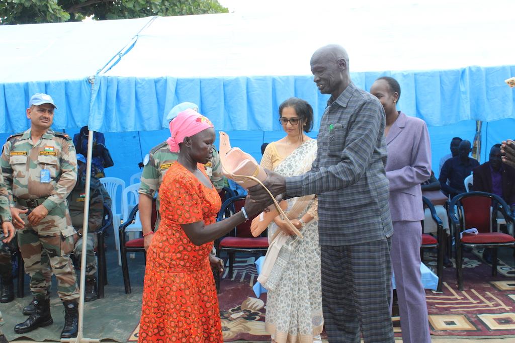 A woman in Bor receives an artificial leg years after she lost her own. The Indian peacekeepers helped many in a similar situation by distributing prosthetic limbs. Photos: Mach Samuel & Gideon Sackitey/UNMISS