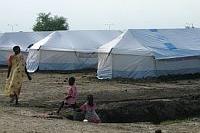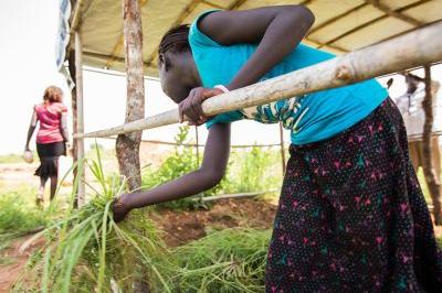 Displaced girl building family shelter at Juba UN House protection of civilians area after arriving from UNMISS Tomping base during ongoing relocation exercise. Photo: UNMISS/JC Mcilwaine