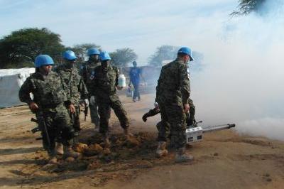 UNMISS Nepalese soldiers fumigating UNMISS Bor protection of civilians area to rid it of hazardous insects like malaria mosquitos. Photo: UNMISS/Adebayo Adokunle