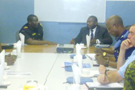 Briefing in MONUSCO Conference Room for the delegation. On the right the head of office M. Cheikh Bangoura, on the left the Police Commissioner of PNC M. Bisengimana. Pho to MONUSCO Piergiorgio Paglialonga . Mbuji Mayi 14…